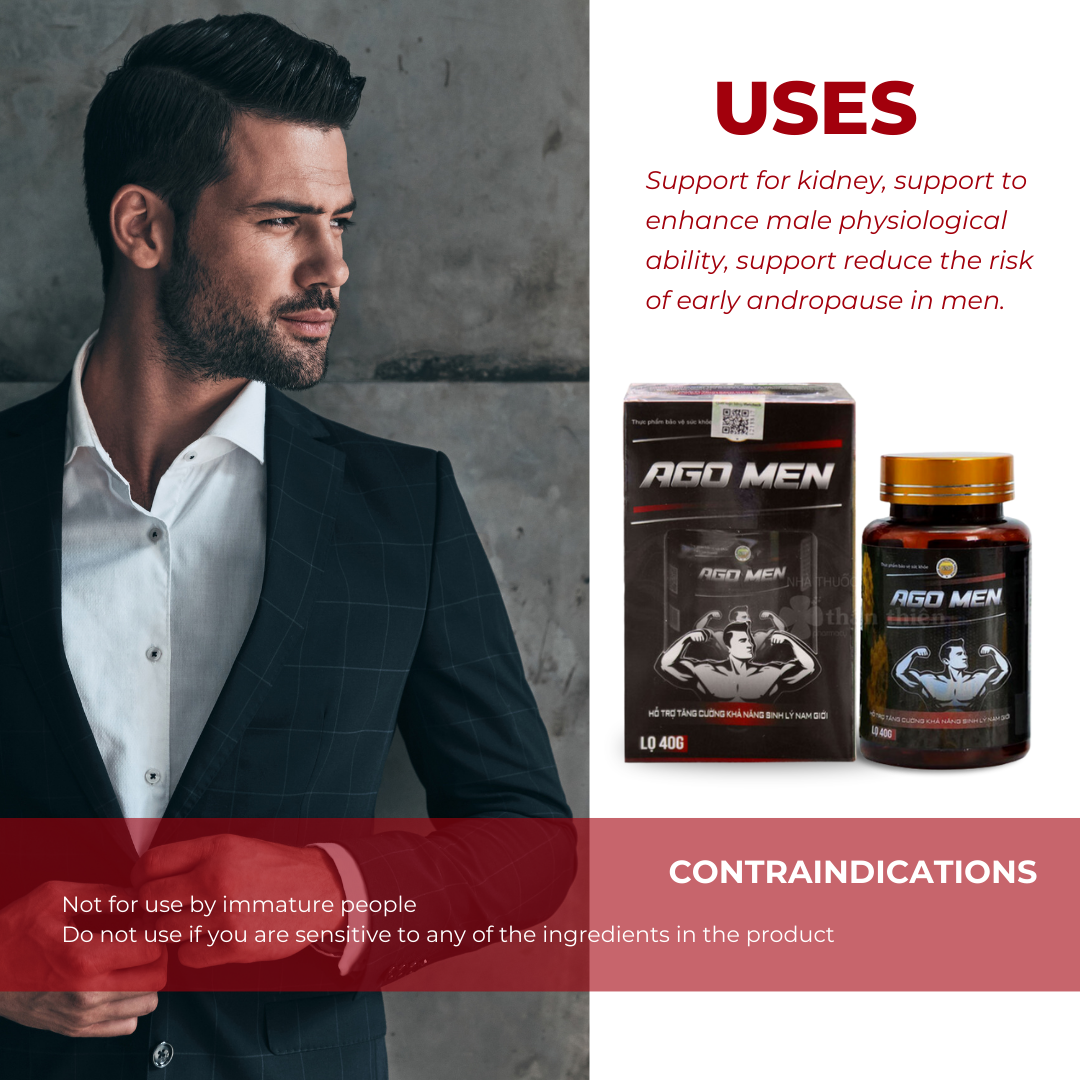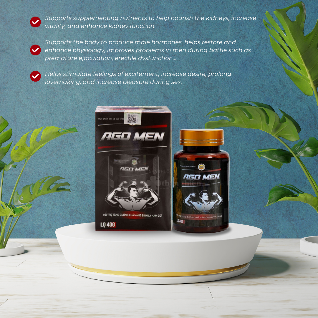 AGO MEN is a Vietnamese herbal supplement crafted to help men restore vitality, enhance physiological performance, and slow down early andropause (male menopause) naturally.