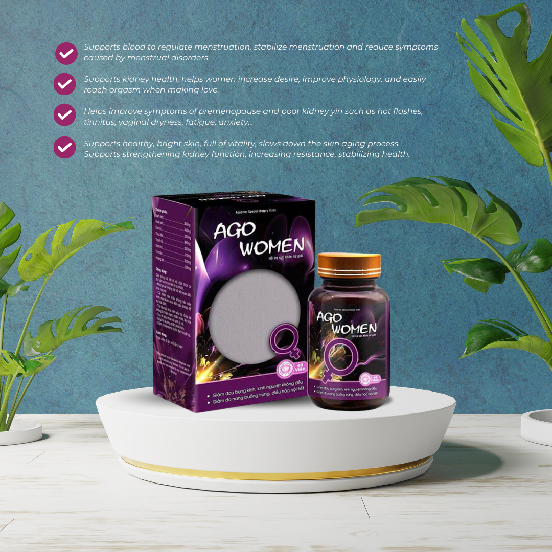 Formulated with Vietnamese herbal wisdom and modern GMP-certified production, AGO Women supports blood circulation, regulates menstruation, enhances female physiology, and strengthens kidney function — the root of hormonal balance.