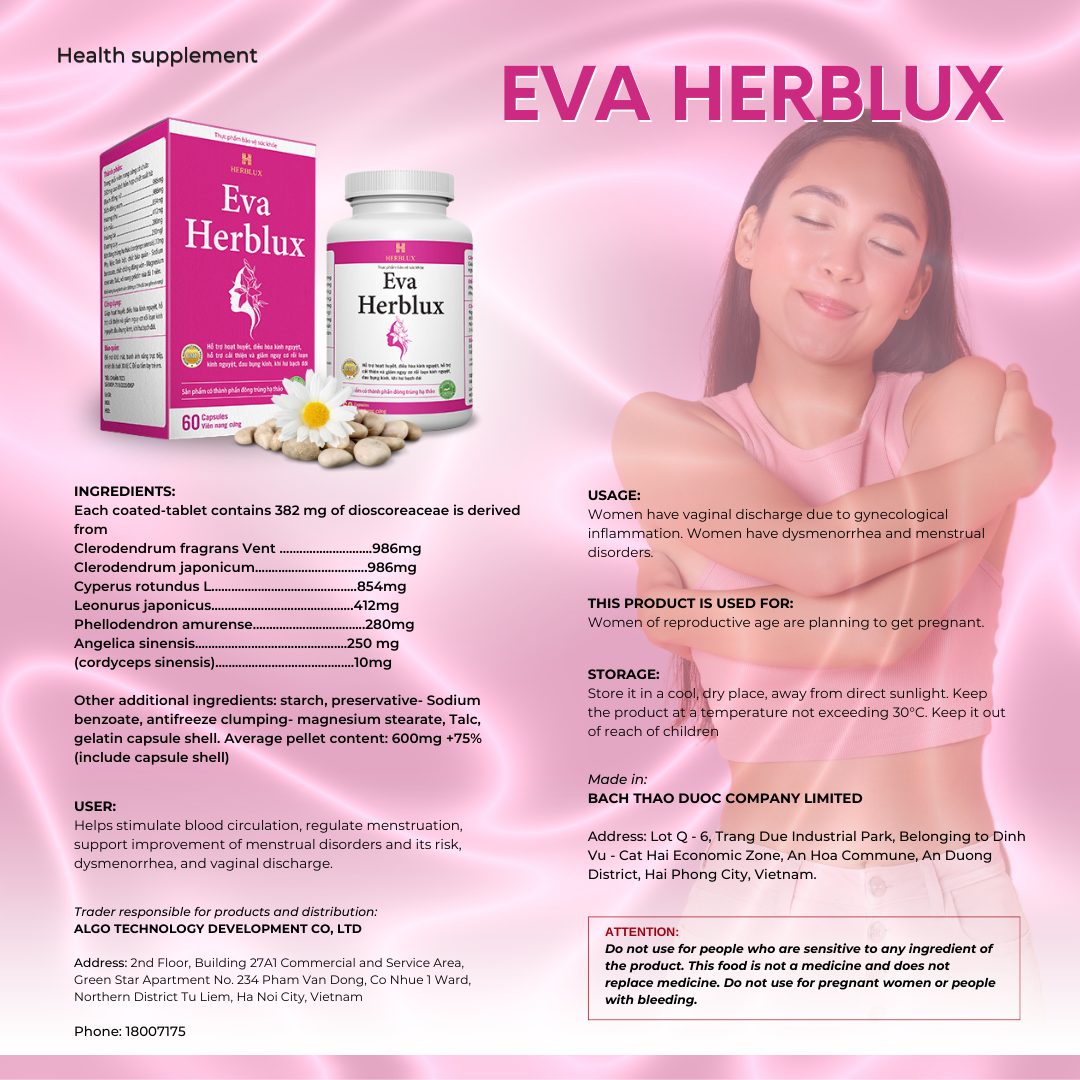EVA HERBLUX is a premium Vietnamese herbal formula that supports the treatment of gynecological infections, regulates menstrual cycles, and enhances female hormones naturally — helping you restore comfort, balance, and confidence every day.